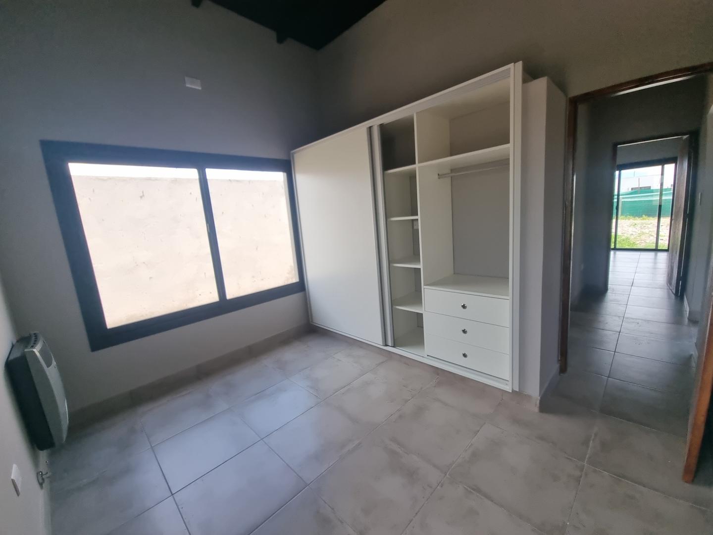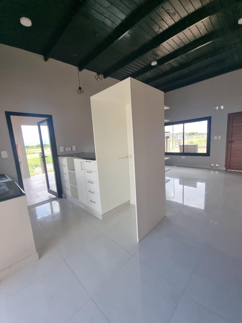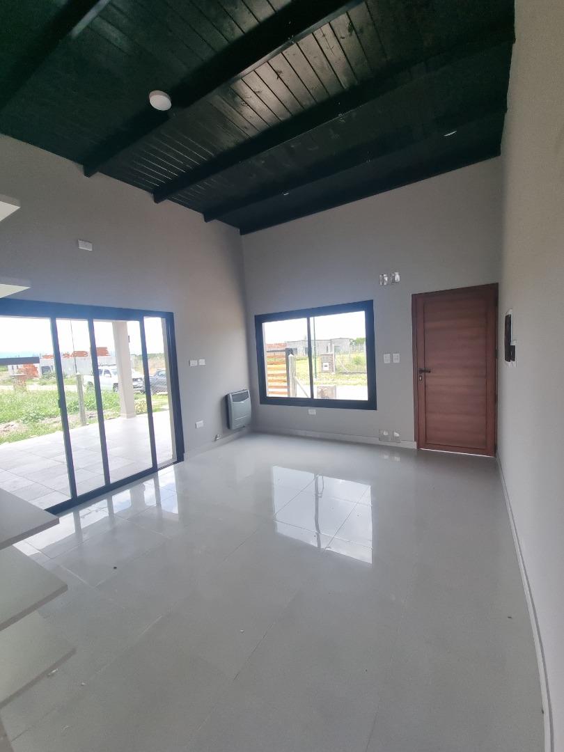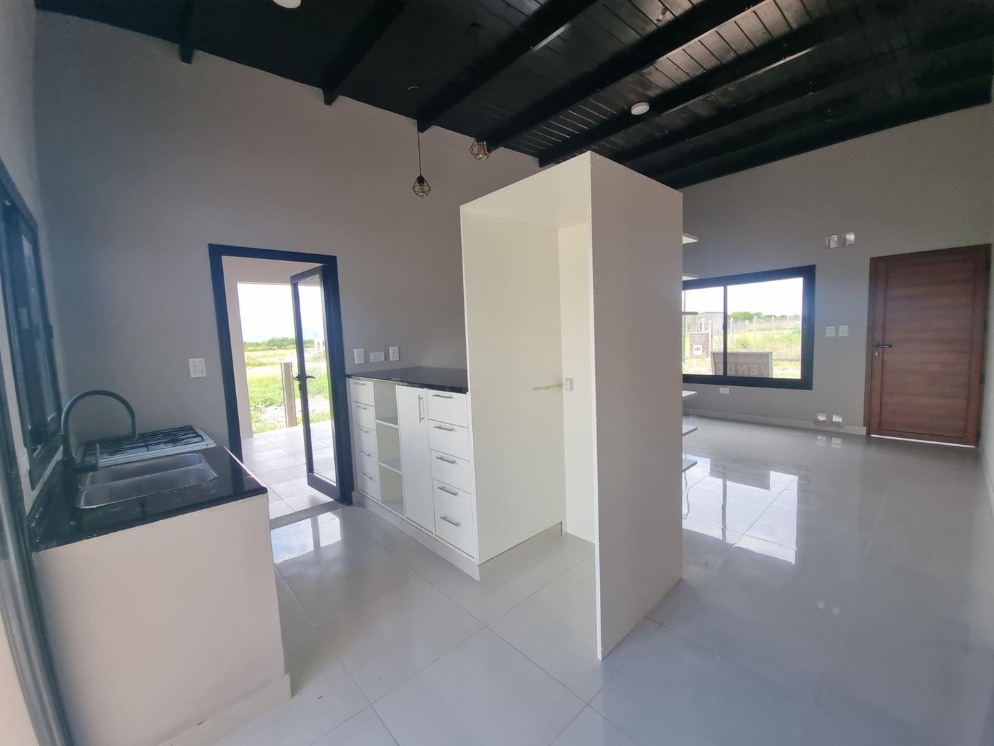 La casa es de una planta con dos dormitorios, cocina con living comedor integrada, con muebles de balo mesada y cocina a gas. Cuenta con cochera o galería y su parrilla.