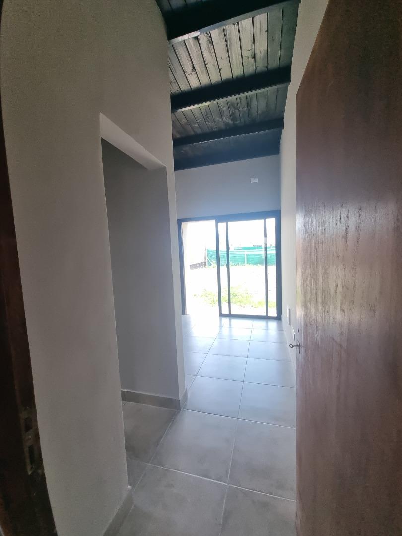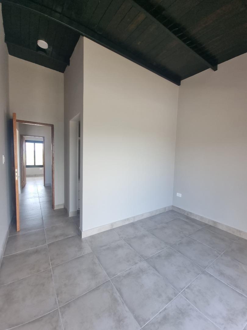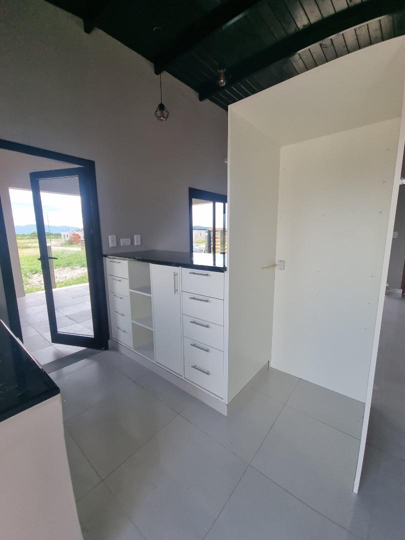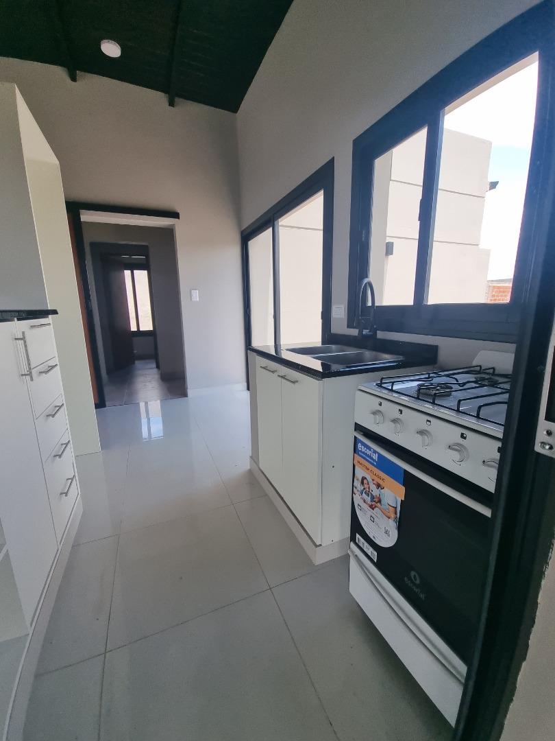 La casa es de una planta con dos dormitorios, cocina con living comedor integrada, con muebles de balo mesada y cocina a gas. Cuenta con cochera o galería y su parrilla.